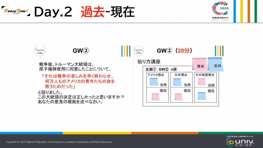 グループワークでは、原爆を落とした側の視点に立ってみようという企画を行いました。なぜ原爆を落とすのか、原爆を落とす側の賛成意見や、その他の国の視点に立って参加者に考えてもらいました。
