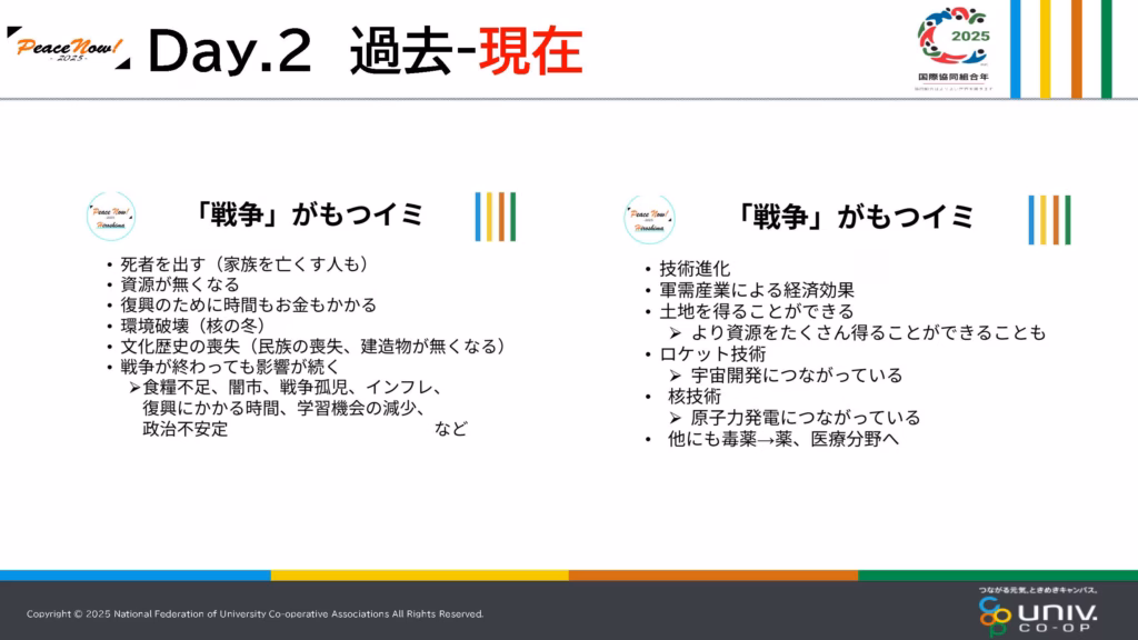 左側が、戦争のデメリットの部分、死者を出す、環境破壊につながるといった内容です。右側は良い点、技術の進化やロケット技術、宇宙開発にも繋がっています。
