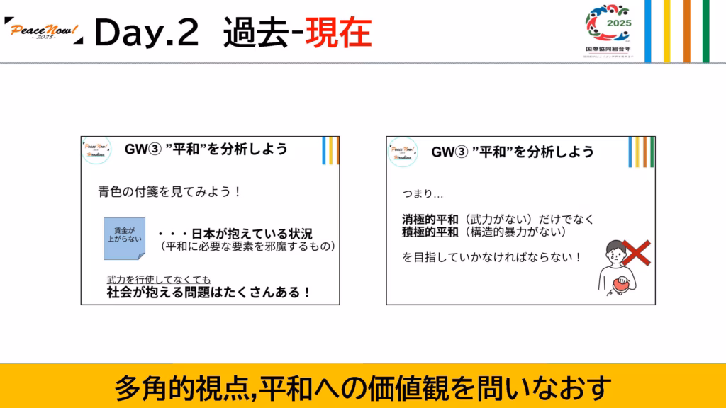 ここまでの取り組みを経て、現在の日本は平和なのかと考えた時に、例えば、武力を行使していなくとも、賃金が上がらないなど、日本が置かれている状況を見ると、全然まだまだ平和とは言えないんじゃないかといった意見も出てきました。中には「今の日本は平和ですか?」って聞かれたら、「はい」と答えるけど、それってもしかしたら平穏と勘違いしているのではないか、といった疑問が出てくるといったように、改めて参加者自身が平和について分析することが出来たと思います。