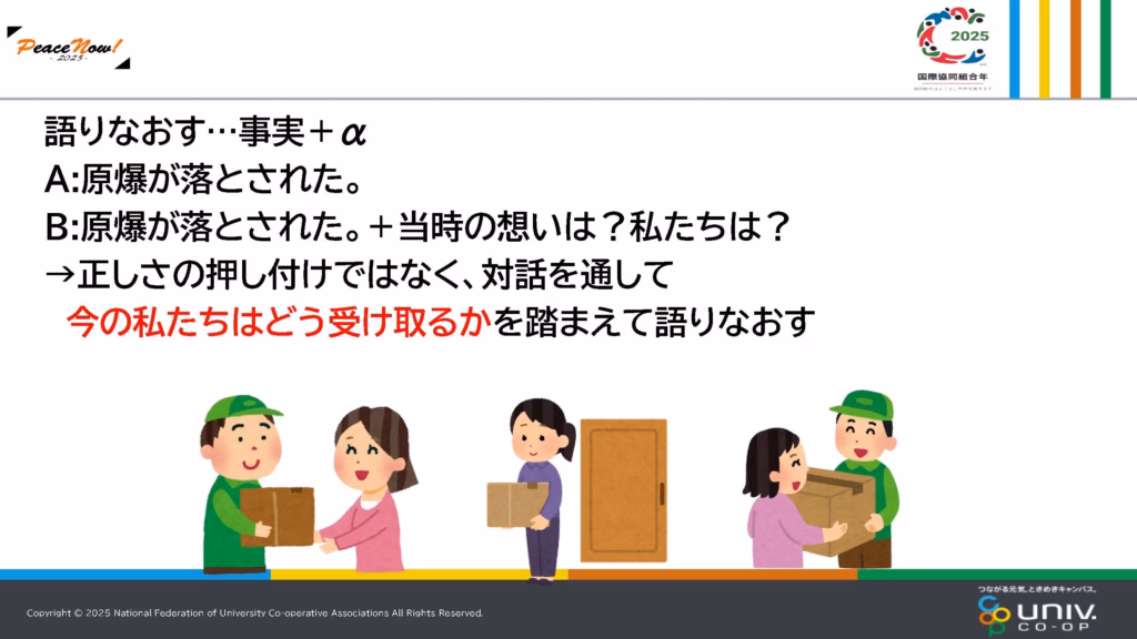 決して正しさの押し付けだけではなく、それを聞いた私たちが対話を通して、今の私たちはそれをどう受け取るか、考えるか、を踏まえて「語りなおす」としています。
